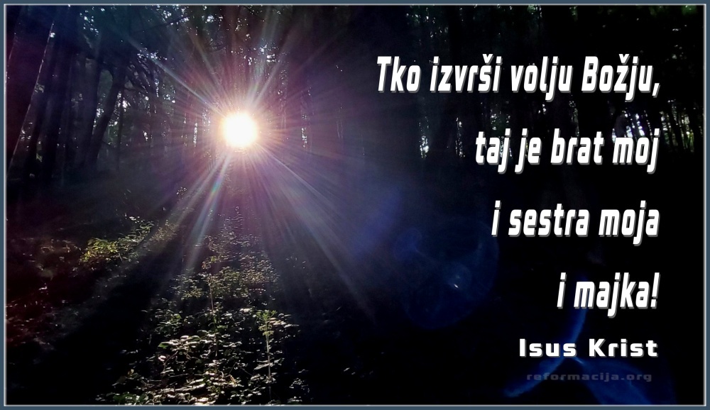 “Dođu tada braća i majka njegova. I stojeći vani pošalju k njemu da ga pozovu. I mnoštvo sjeđaše oko njega. I rekoše mu: ‘Eno te vani majka tvoja i braća tvoja traže!’ I odgovori im govoreći: ‘Tko je majka moja ili braća moja?’ I osvrnuvši se uokrug na one što su sjedili oko njega, reče: ‘Evo majke moje i braće moje! Jer tko izvrši volju Božju, taj je brat moj i sestra moja i majka.'” (Mk 3,31–35.)